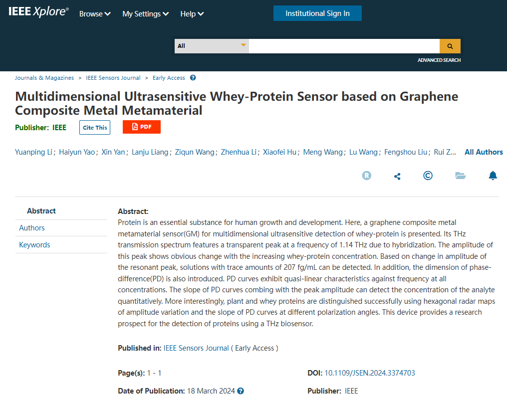 近日,公司山东省太赫兹科学技术及应用创新团队梁兰菊教授课题组制备了一种用于蛋白检测的多维高灵敏传感器,实现了207fg/ml的痕量检测及浓度定量分析。研究成果以“Multidimensional Ultrasensitive Whey-Protein Sensor based on Graphene Composite Metal Metamaterial”为题发表在《IEEE Sensors Journal》上(中科院二区)。该成果由公海gh555000aa线路检测、安徽理工大学合作完成。公海gh555000aa线路检测山东省太赫兹科学技术及应用创新团队李院平教授为文章第一作者,公海gh555000aa线路检测为第一署名单位。该研究工作得到了国家自然科学基金、山东省自然科学基金、山东省高校科技创新团队及人才支持计划等资助。