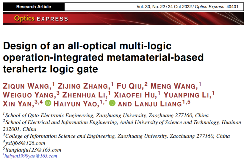 近日,公司公海gh555000aa线路检测山东省太赫兹科学技术及应用创新团队梁兰菊教授课题组设计了一种半导体-金属杂化超材料构成的全光太赫兹逻辑门器件,实现了NOR/OR布尔运算。研究成果以“Design of all-optical multi-logic operation integrated metamaterial-based terahertz logic gate”为题发表在Optics Express。