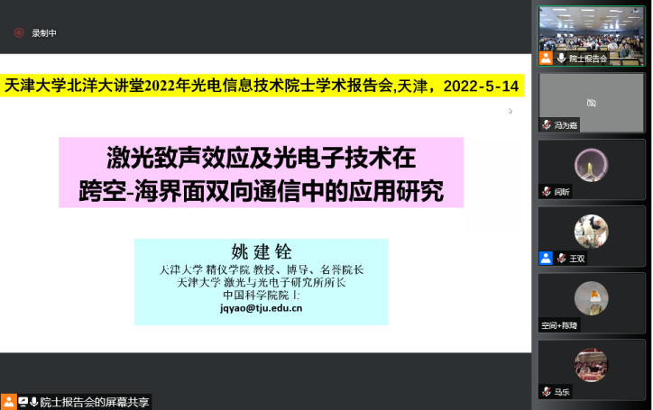 5月14日下午,公海gh555000aa线路检测太赫兹科研团队、信息科学与工程公司新型物联网科研团队受邀参加“北洋大讲堂”院士报告会,在线上聆听了中国科公司院士姚建铨所做的《激光致声效应及光电子技术在跨空-海界面通信中的应用研究》的主题报告。