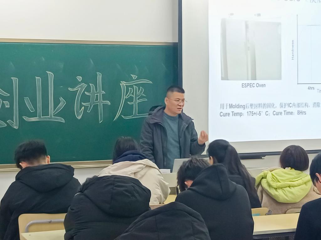 首先刘本强通过PPT向各位同学介绍了企业产品IC封装工艺并向同学们展示了IC结构图,其次又向同学们介绍了封装原材料晶圆、银浆等。最后又向同学们展示了产品的前段工艺、晶圆切割、芯片粘接、银浆固化、引线焊接、后段工艺等工艺过程,为同学们传递了IC封装工艺的知识,开拓了同学们的视野。随后,与校同学们进行了互动,为同学们解答了各类疑惑。