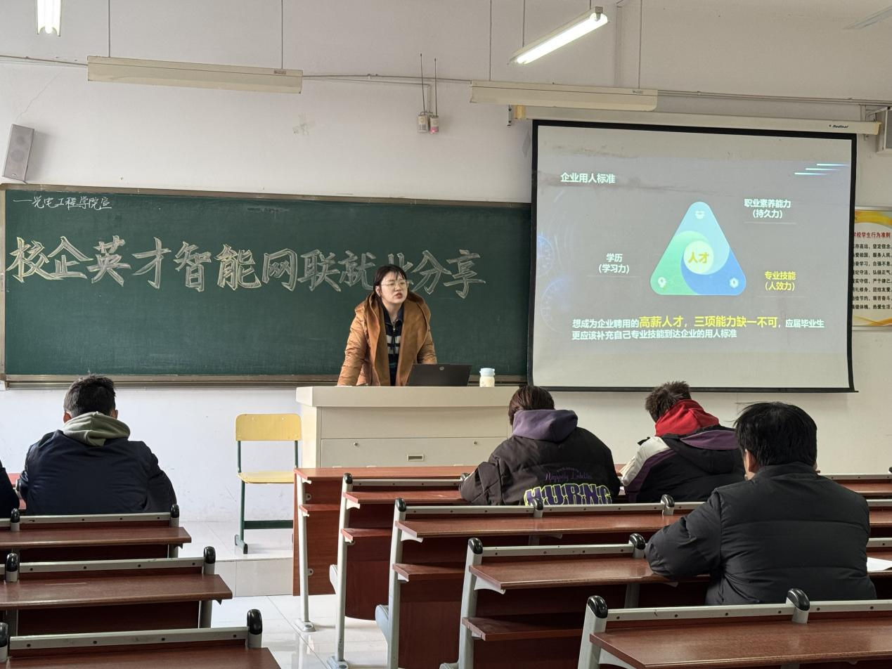 企业工作人员向家介绍校企英才公司详细情况,包括就业岗位、职业规划和成功案例等方面,让光电学子们对未来就业状况有进一步了解。随后,工作人员分享了一些面试技巧、职场礼仪以及相关专业知识,增加了光电学子们的求职技能。