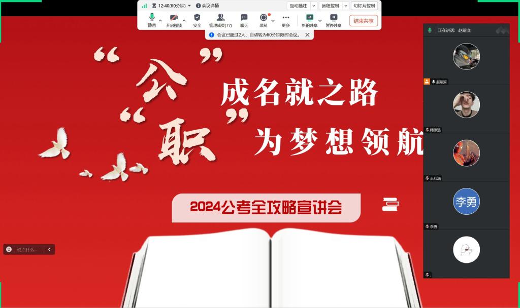 为了帮助广大学子拨开公考迷雾,精准把握职业方向,9月13日,公司召开了公考全攻略宣讲会,本次会议以线上的方式进行。