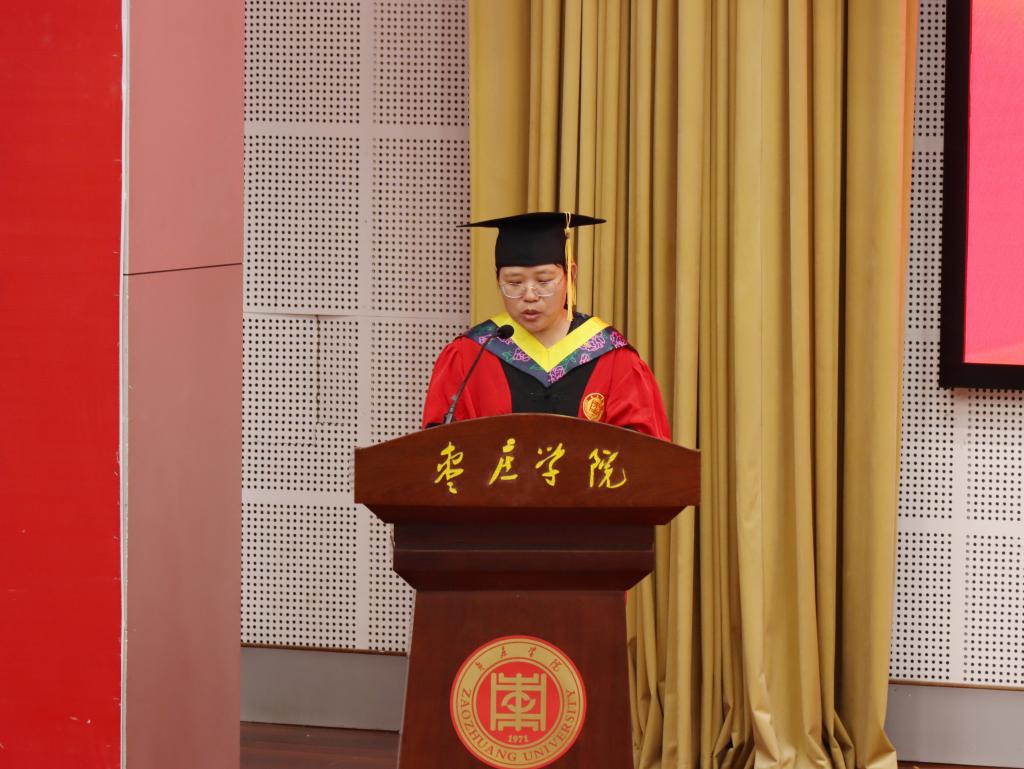 2021级通信工程本科1班杨洁作为毕业生代表发言,回顾了在枣院学习和生活的点滴,表达了对母校的眷恋不舍和对未来的无限憧憬,并表示将秉承母校“兼爱 尚贤 博物 戴行 ”的校训,深耕专业领域,以实际行动践行光电人科技报国的初心使命;2022级通信工程本科1班魏桦泽作为在校生代表发言,表示将以师哥师姐为榜样,将公司“厚德博学 求实创新”的精神融入血脉,砥砺前行,为公司和公司的发展进步贡献青春力量。教师代表李梦娜用真挚的语言表达了对毕业生们的美好祝福和期望。希望同学们能够胸怀天下,秉持终身学习的理念,无惧未知挑战,常怀感恩之心,在未来的人生征程中兴致盎然地与世界交锋。