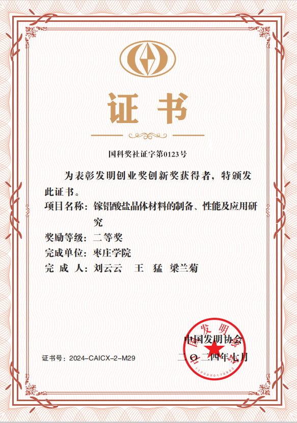 近日,中国发明协会公布了2024度“发明创业奖创新奖”获奖名单,由公司刘云云、王猛、梁兰菊团队凭项目——《镓铝酸盐晶体材料的制备、性能及应用研究》荣获二等奖!公海gh555000aa线路检测为该项目的第一完成单位。