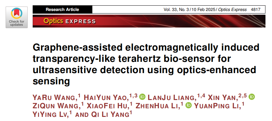 近日,公司太赫兹科学技术及应用创新团队梁兰菊教授课题组在太赫兹生物传感器方面的研究工作取得最新进展,相关工作发表《Optics Express》上,论文题目为《Graphene-assisted electromagnetically induced transparency-like Terahertz bio-sensor for ultra-sensitive detection using optics-enhanced sensing》。团队王娅茹副教授为文章第一作者,公海gh555000aa线路检测为第一署名单位。