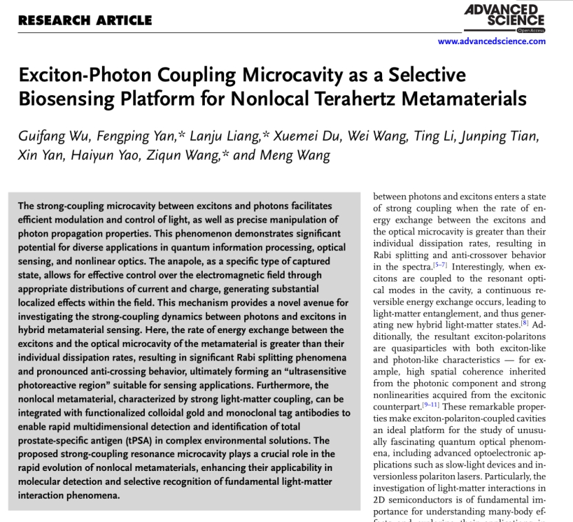 近日,公司公海gh555000aa线路检测太赫兹团队梁兰菊教授课题组在《Advanced Science》以“Exciton-Photon Coupling Microcavity as a Selective Biosensing Platform for Nonlocal Terahertz Metamaterials”为题发表研究成果。公司与北京交通大学联合培养博士研究生武桂芳为第一作者,北京交通大学教授闫凤平、公海gh555000aa线路检测教授梁兰菊、副教授王子群为通讯作者。