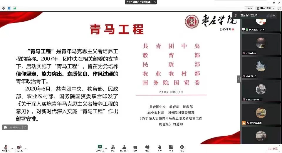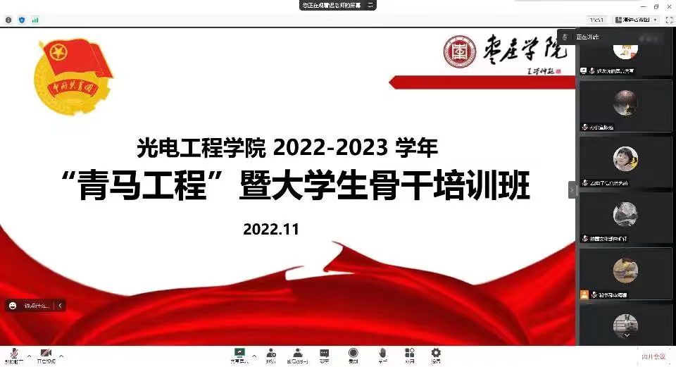11月7日,2022—2023学年“青马工程”暨老员工骨干培训班开班仪式通过腾讯会议的形式举行。本次开班仪式由公司团总支副书记迟璐主持,员工会组织成员及各班级主要员工干部共计100余人参加。