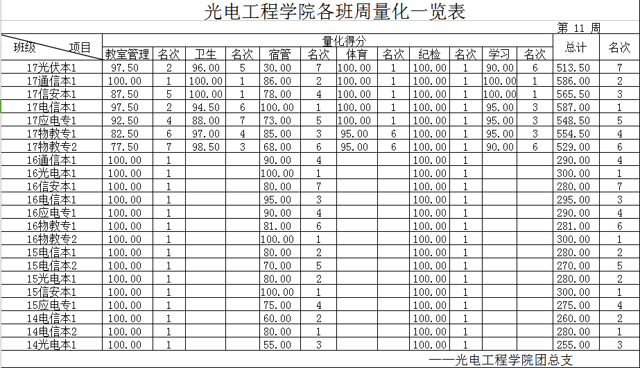 [量化成绩] 2017-2018-2 第十一周各班量化一览表