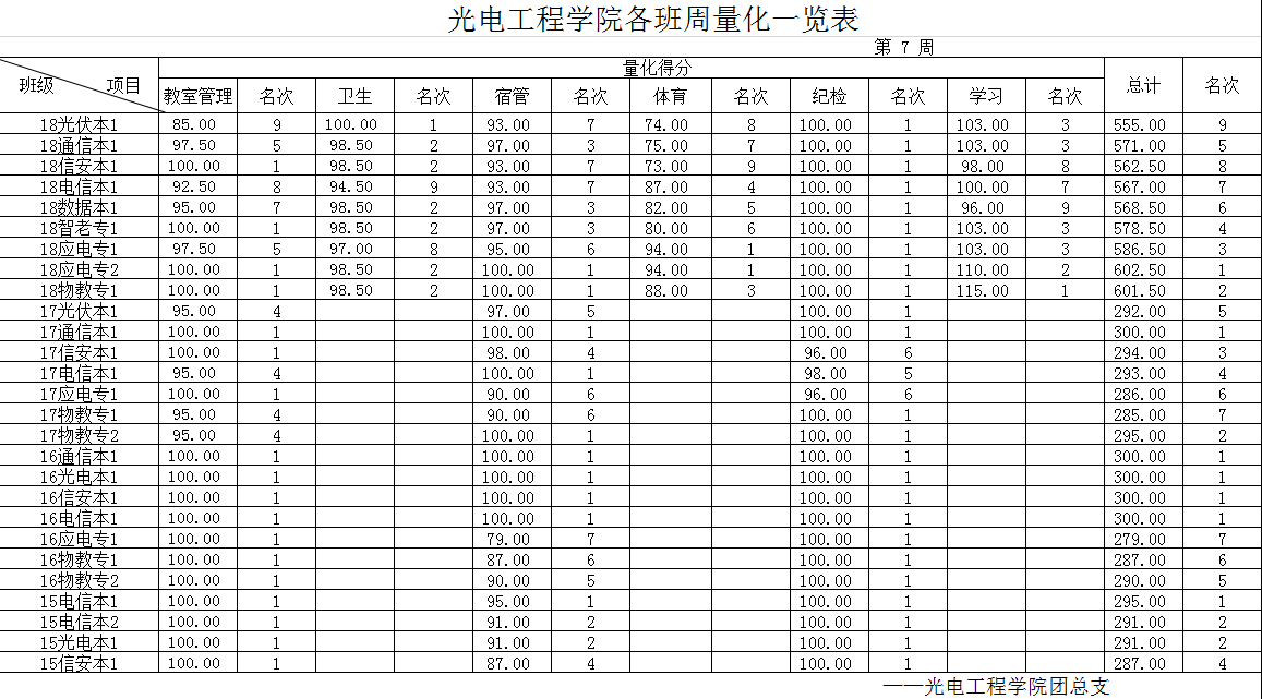 [量化成绩] 2018-2019-1 第7周各班量化一览表