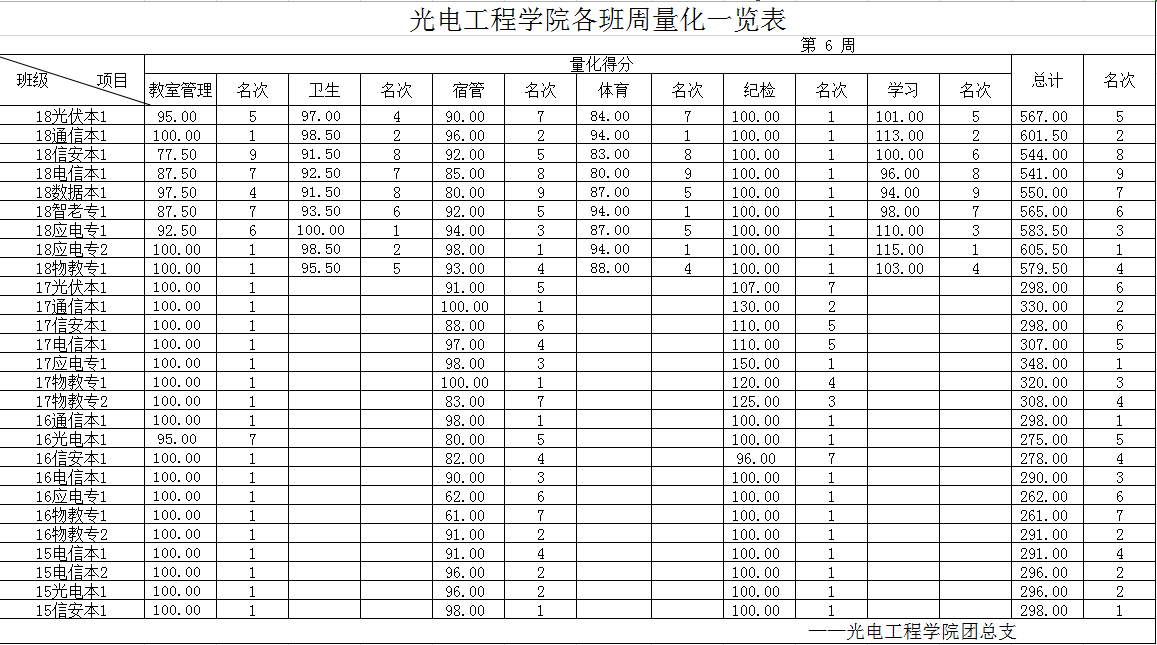[量化成绩] 2018-2019-1 第6周各班量化一览表