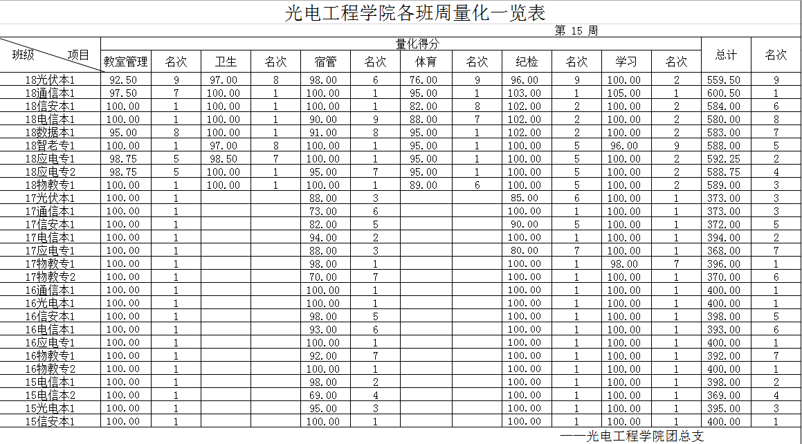 [量化成绩] 2018-2019-1 第15周各班量化一览表