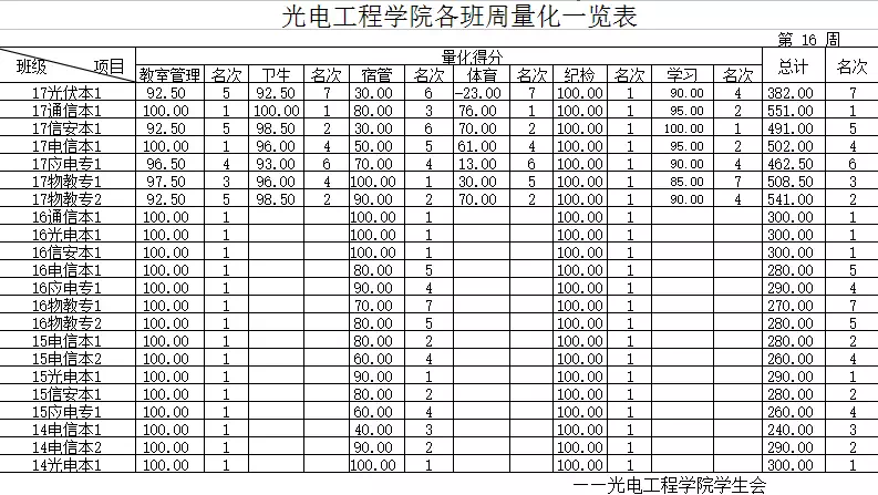 [量化成绩] 2017-2018-2 第十六周各班量化一览表
