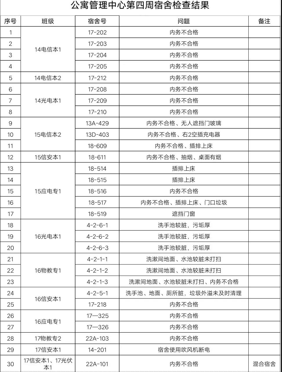 [结果通报] 2017-2018-2 员工公寓校级检查结果通报(第四周)