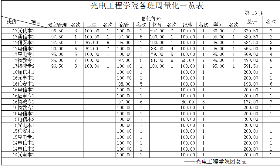 [量化成绩] 2017-2018-2 第十三周各班量化一览表