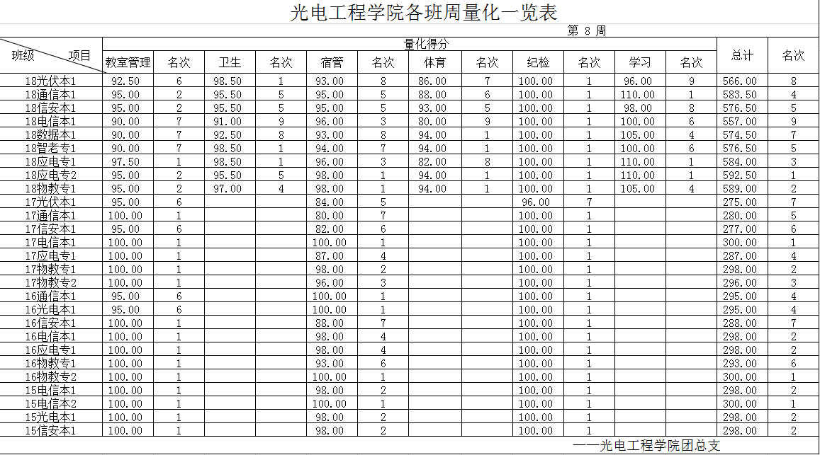 [量化成绩] 2018-2019-1 第8周各班量化一览表