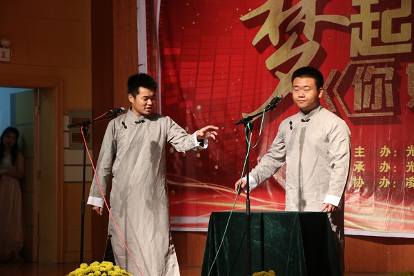 本场晚会节目形式多样,舞蹈、朗诵、歌曲、武术、小品、相声、乐队合奏等,内容精彩纷呈,现场观众掌声如雷。一场场完美的演出映入眼帘,其中《致党·爱国》的朗诵表演向党组织表达了崇高的敬意,自弹自唱的《房间》让同学们漫游其中,紧绷的神经顿时放松。小品《傻人有傻福》用欢笑向我们传递正能量:幸福平安中国梦,防范诈骗全民行。相声《少壮需努力,老大不伤悲》和双簧《老员工活》一唱一和的精彩表演,更是给观众留下了深刻的印象。精彩纷呈的节目过后,领导老师与晚会演职员合影留念。