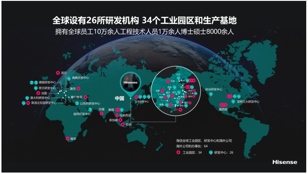 在谷歌与凯度联合发布的《BrandZ™中国全球化品牌50强》中,海信已经连续8年成为中国全球化品牌10强,产品远销160多个国家和地区,连续赞助2016年欧洲杯、2018年世界杯和2020年欧洲杯、2022年世界杯、2024年欧洲杯等世界顶级体育赛事。海信是国家首批创新型企业,两次获得“全国质量奖”。目前,海信拥有青岛、顺德、江门、斯洛文尼亚、南非、墨西哥等34个工业园区和生产基地,设有青岛、深圳、美国、德国等共26所研发机构,设有64个海外公司和办事处,拥有工程技术人员1万余人,硕士博士8000余人,初步建立了全球协同的研发体系。海信集团因持续研发绿色低碳技术、积极履行社会责任等卓越表现三度入选《财富》中国ESG影响力榜。