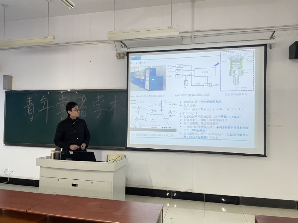 第一场报告是李振华老师的主题为“Ⅲ族氮化物材料的分子束外延技术”的报告。首先,李老师介绍了Ⅲ族氮化物材料的发展历史和材料性质。Ⅲ族氮化物材料被广泛应用于5G通信、医疗、军事、电力传输与控制、新能源汽车、消费电子等领域;其次,李老师对分子束外延系统的构成和原理进行了详细的介绍。李老师讲到,分子束外延技术具有超高真空、超洁净、无氢的生长环境,外延薄膜质量高,可实现原子级平整的界面,适合做Mg掺杂和生长超晶格等精细结构。最后,李老师以GaN的分子束外延生长为例介绍了生长过程中的关键问题,并解答了同学们提出的相关问题,帮助同学们加深对报告内容的理解。