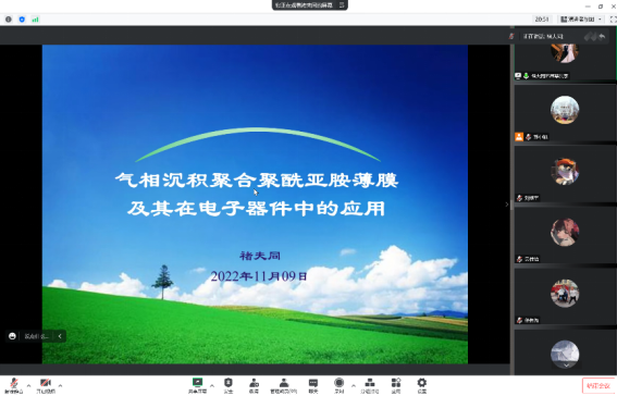 褚夫同博士做了题为《气相沉积聚合聚酰亚胺薄膜及其在电子器件中的应用》的学术报告,报告主要介绍了气相沉积聚合PI薄膜的制备及微电子器件的制作过程,并探索了PI作为器件核心部分在薄膜体声波谐振器、压电微机械超声换能器及氮化镓高电子迁移率场效应晶体管中的应用。