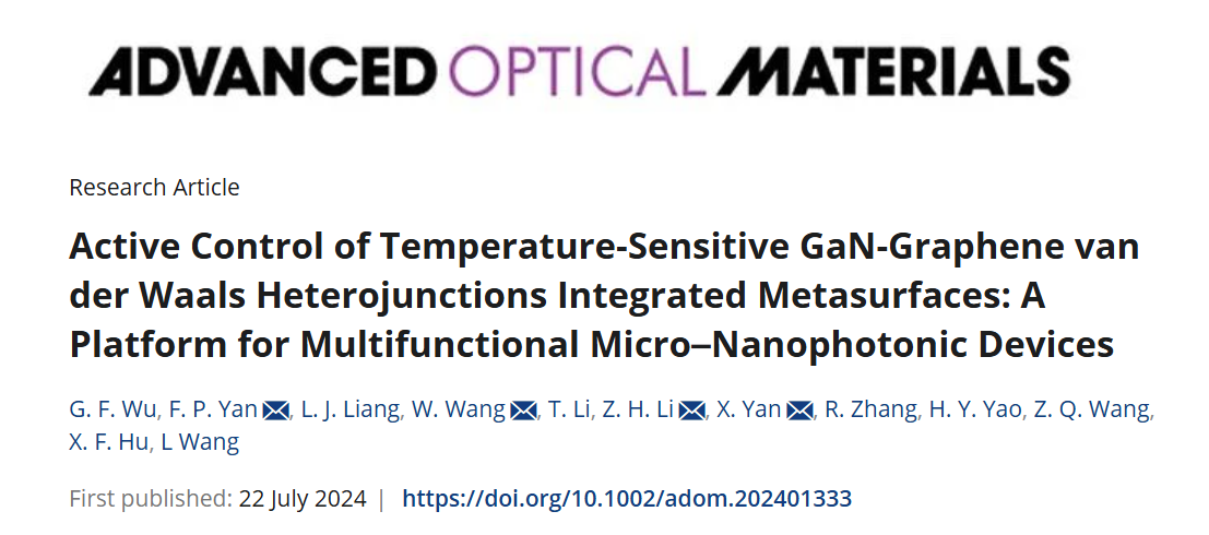 近日,公司公海gh555000aa线路检测山东省太赫兹科学技术及应用创新团队梁兰菊教授课题组联合培养研究生武桂芳设计了一种基于氮化镓/石墨烯范德瓦尔异质结与超表面集成的多功能温敏纳米器件。研究成果以“Active control of temperature-sensitive GaN-graphene van der Waals heterojunctions integrated metasurfaces: a platform for multifunctional micro–nanophotonic devices”为题发表在Advanced Optical Materials。