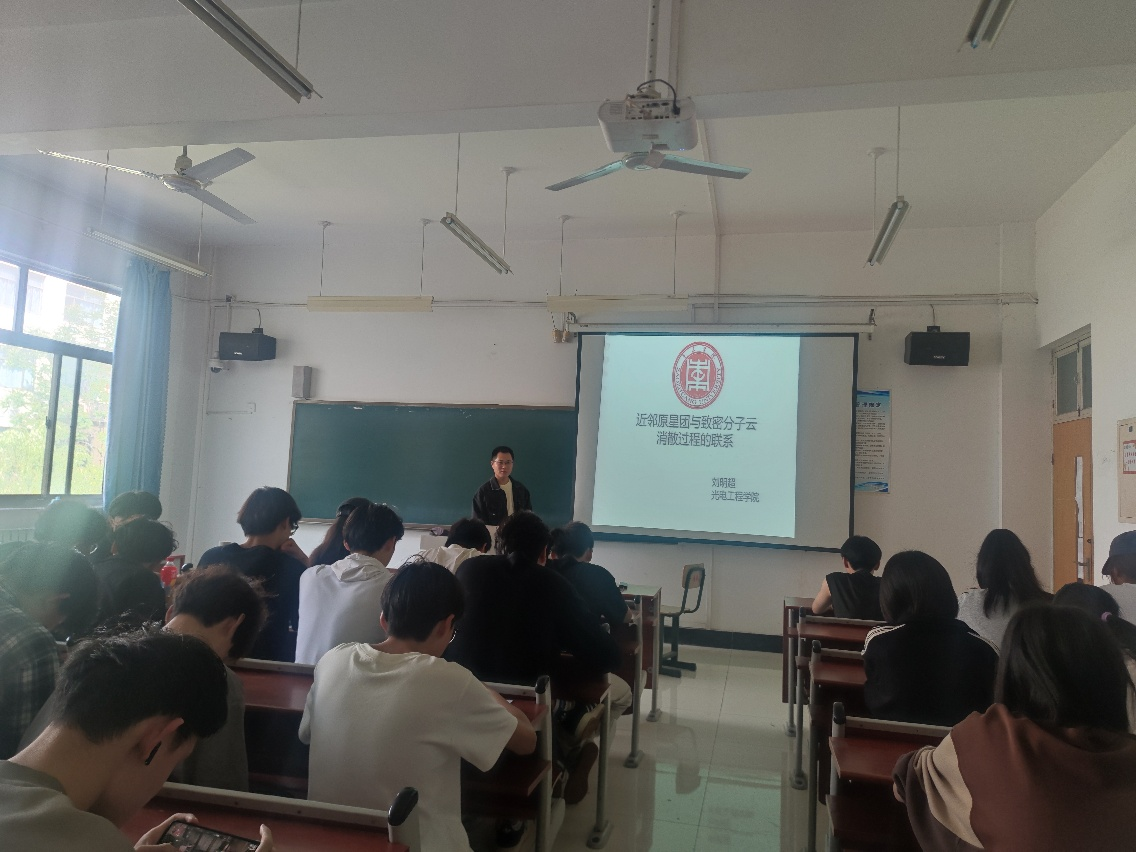 刘明超博士做了题为《近邻原星团与致密分子云消散过程的联系》的学术报告,报告先简单介绍了恒星与星际介质的物质循环过程,随后讲解了恒星在形成过程中的复杂影响因素:恒星初始质量、盘的吸积过程,盘的倾角对观测的影响等等,还有星团形成过程中的复杂因素的参与,像母分子云的初始质量、湍流、恒星反馈等等。刘博士的主要工作是利用Spitzer和Herschel观测数据剖析星团形成过程中呈现出的现象,探索其规律。其工作从原星团和分子云的空间分布中发现,更小尺度上的致密星团与致密分子云呈现出规律的分布关系,这个关系表明致密分子云的消散过程与更小尺度上的致密星团的演化存在很大的关系。