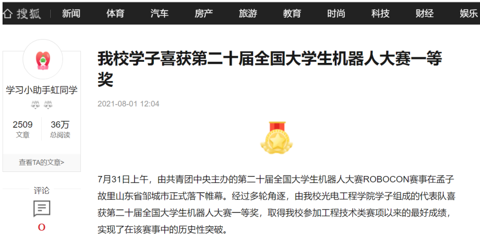 搜狐网报道:公司学子喜获第二十届全国老员工机器人大赛一等奖